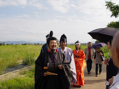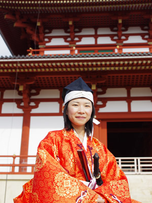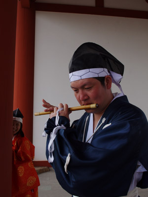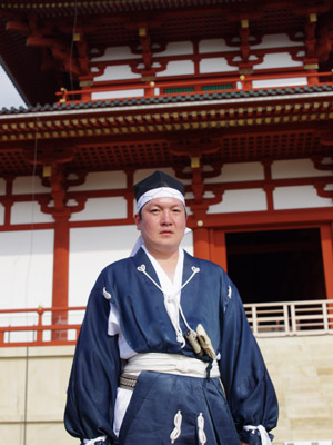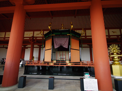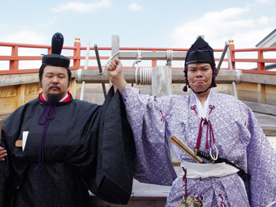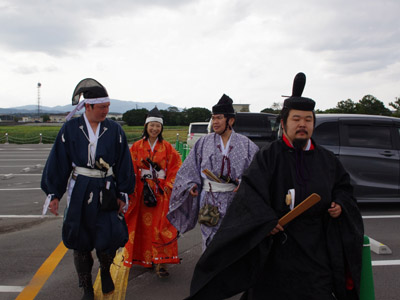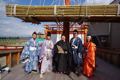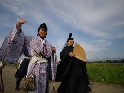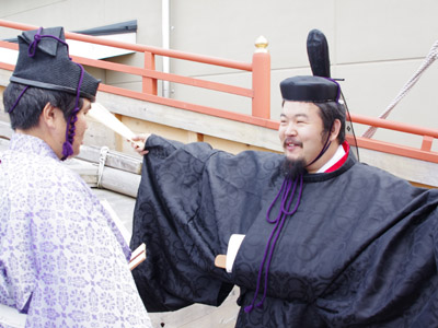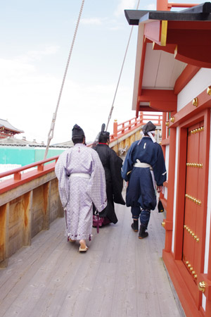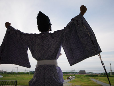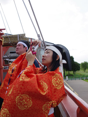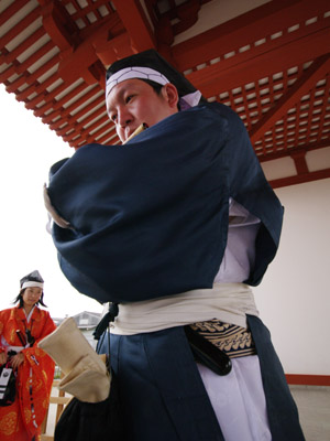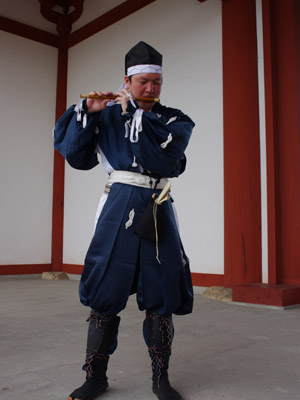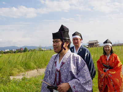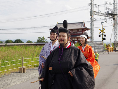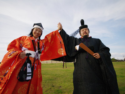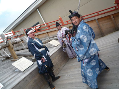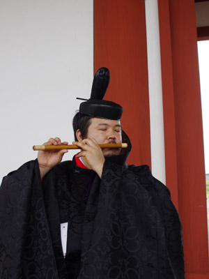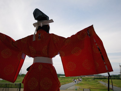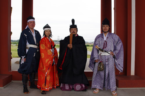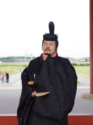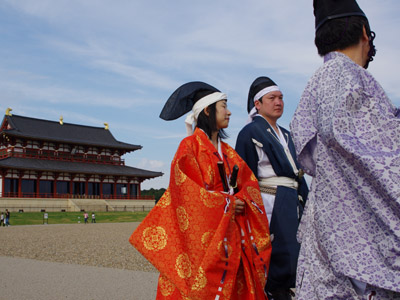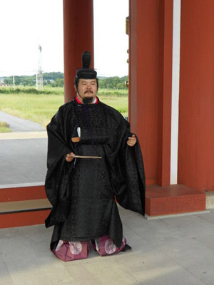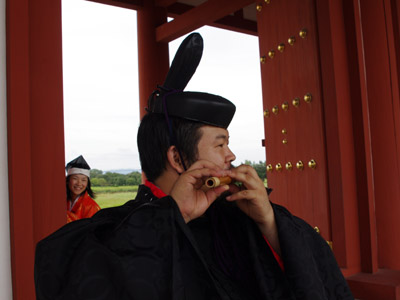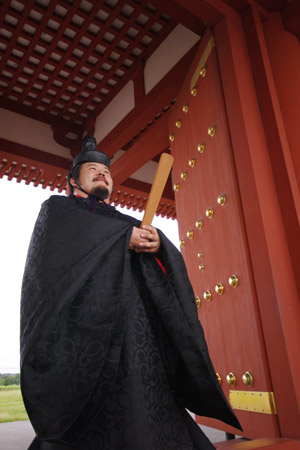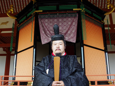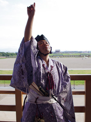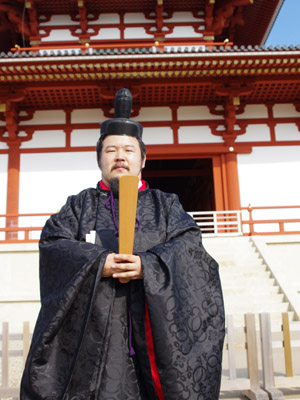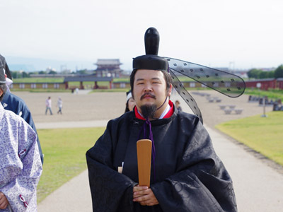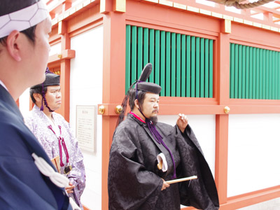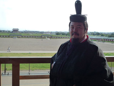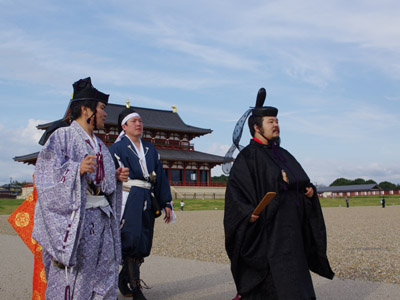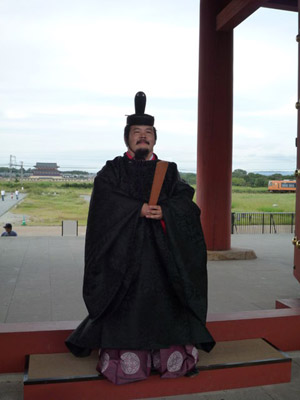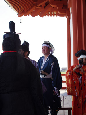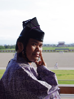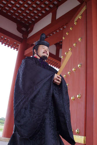 | 船から降りるといよいよ大極殿に参内です。 大極殿に入るまでは檜扇を手にしていたのですが、参内の時はちゃんと笏を手にしました。 参内を終えた後はのんびりと朱雀門へと向かい、朱雀門でも色々と遊ぶことに。 そして歩き…ではなく遊び疲れた後に帰阪いたしました。 |