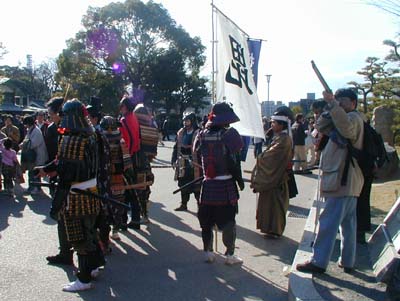 『一海の時代劇なりきり教室』 ついに平成14年2月24日(日)当サイトと有志の方たち共同で甲冑オフ会を開催いたしました! MY甲冑をお持ちの方から「着てみたい!」という方、そして写真撮影、法螺貝吹き、旗持ちなど縁の下の力持ちの方々も参加され、大いに盛り上がりました!! |