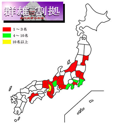 | 現代に甦りし甲冑武者。志を同じくする武者がどこに割拠しているかを表した分布図がこの「群雄割拠」 全国に散らばりし選ばれた武者たちの名乗りをお待ちいたしまする。