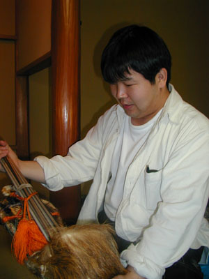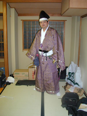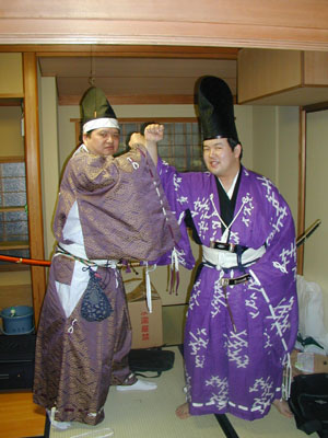 | さて、一海がどうしようもない心の葛藤に悩まされている頃。参加者の方々は準備を進め、壱海隊軍師・横内殿も直垂を装着しました。 横内殿「ふふふ。御大将が箙に心奪われている間に、わしが大将に・・・」 と下克上状態になりかかった頃、一海はようやく慌てて直垂を着用しました。 |