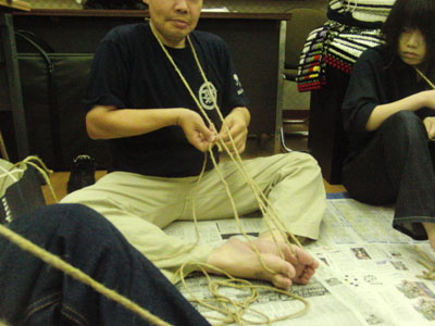 | 長浜城地下の研修室にて手作り甲冑オフ会を開催いたしました。 参加者は講師含めて10名。 内容がちょっと濃すぎて時間が足りなかったですが、充実した内容でした。 午前中は高橋さんを講師に草鞋作りです。 覚えるまでは中々大変でしたが、一度覚えてしまいますと結構簡単に作れます^^ ただその覚えるまで講義するのが大変でしたが、懇切に高橋さんが教えていただきましたので、何とかマスター出来ました^^ ちなみにその成果の一環として縅糸で草鞋調の眼帯を作ってみました。 |