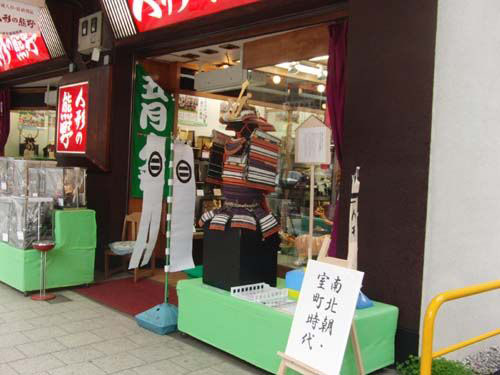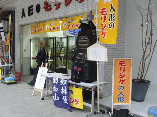 まち博とは実物大の甲冑を時代順に展示し、街中で博覧会をするものです。協力店は天明館さん、人形の熊野さん、三木直さん、モリシゲさんの四店舗です。
