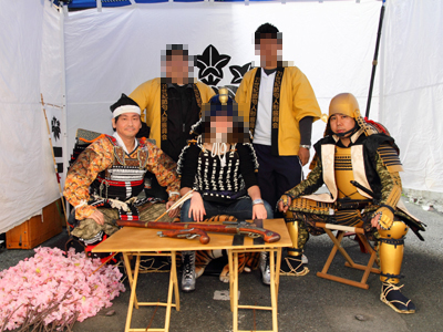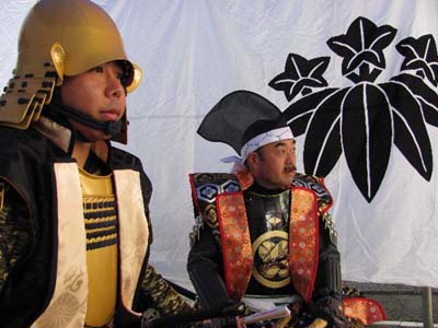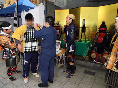 | 凱旋後は甲冑体験会まで休憩です。私も兜を脱ぎ、少し軽装になり体験会突入です。 | |||||||||