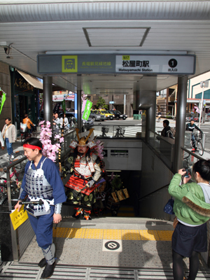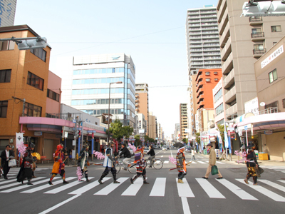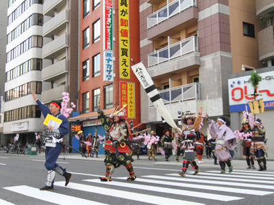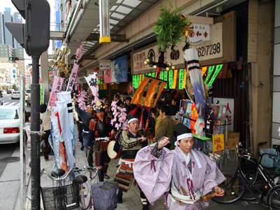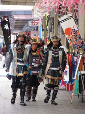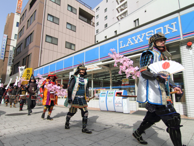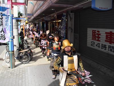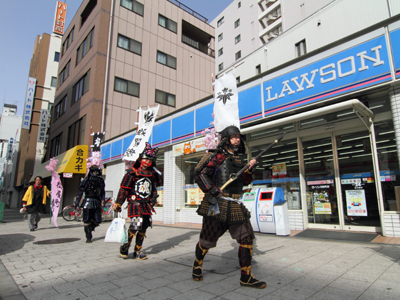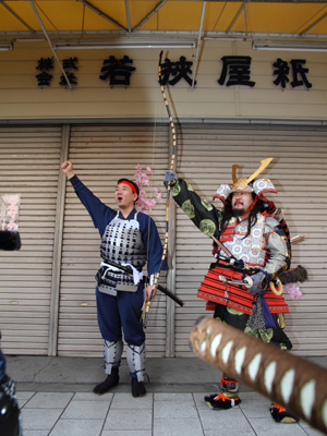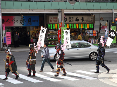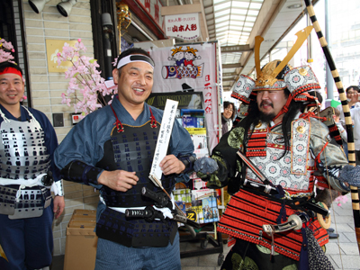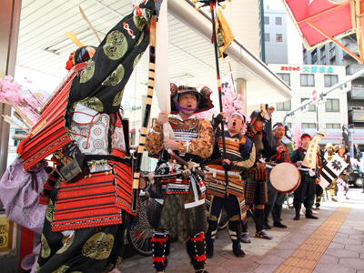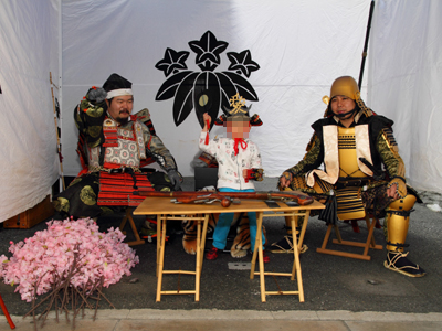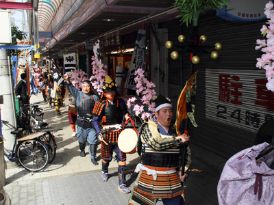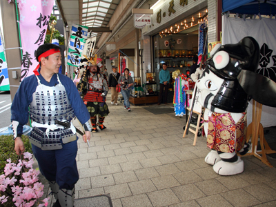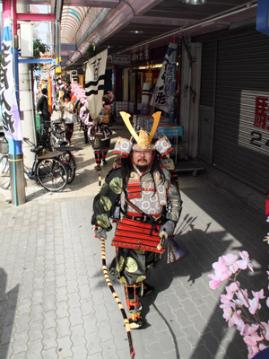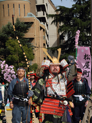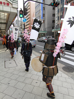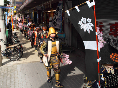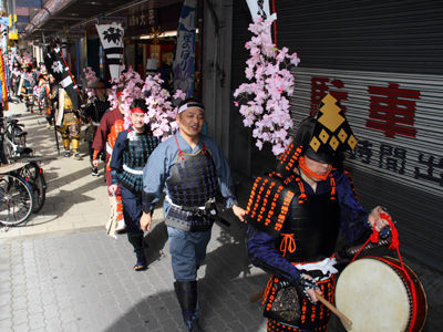 | 今年で四回目の松屋町春の陣。今年は今までと違って「街飾り」に主体を置いてみました。 武者が中心ではなくあくまで街が中心になるように色々とチャレンジしてみました。その一環がまち博です。 また春の陣用ののぼり旗を新調したり、武者に春らしく桜の造花を付けてもらったり、かつ街の方に手作り甲冑を着用・参陣していただきました。 |