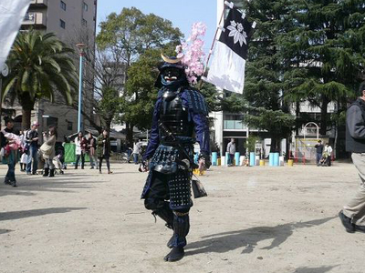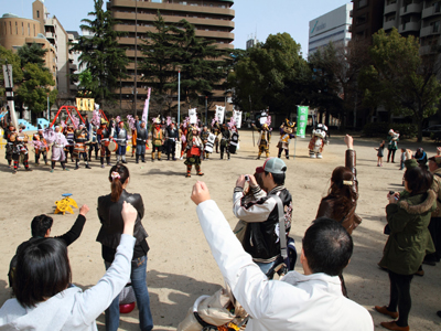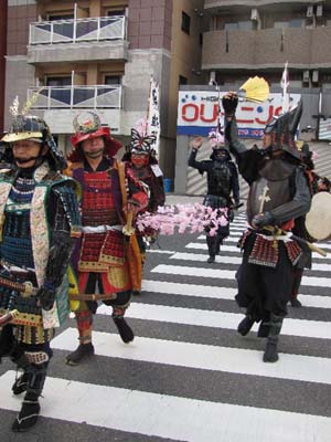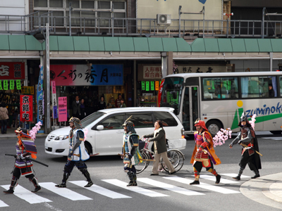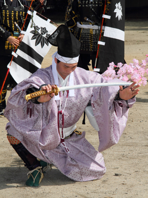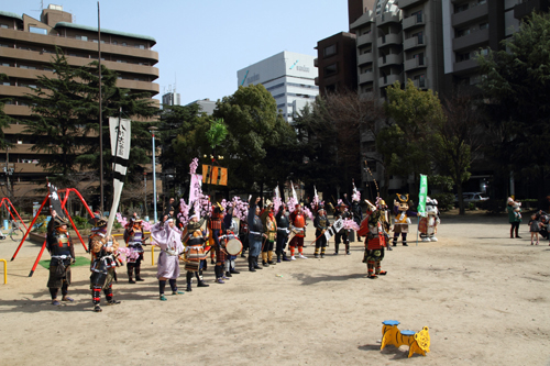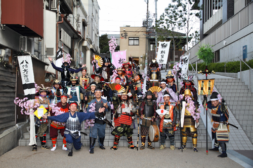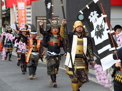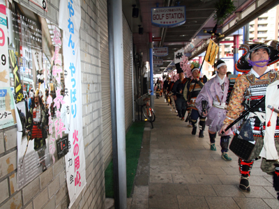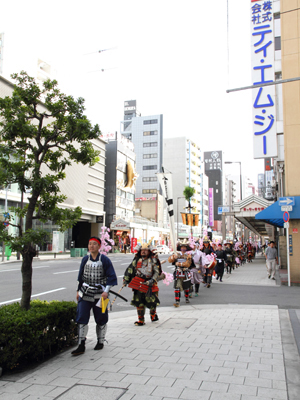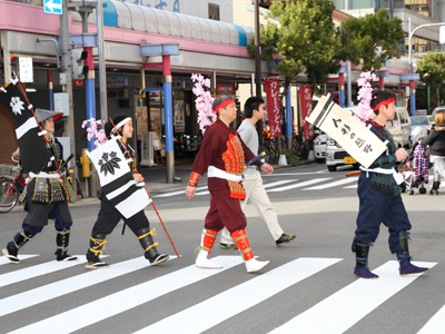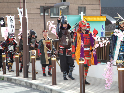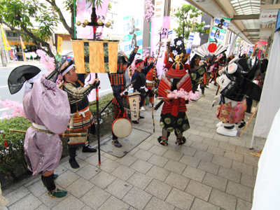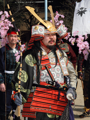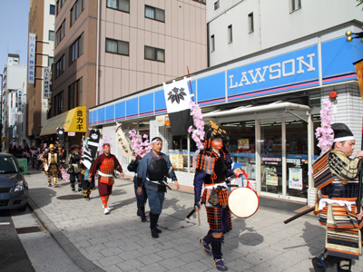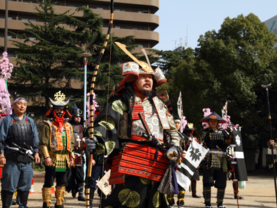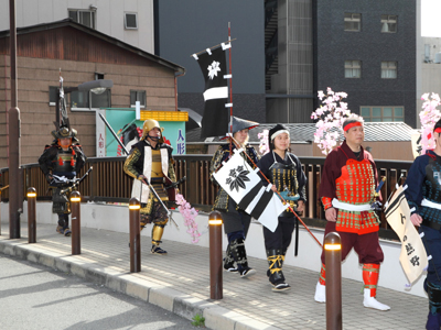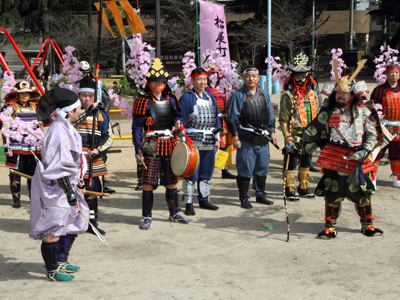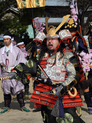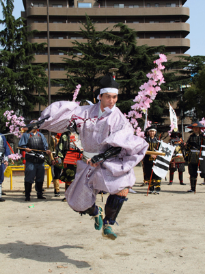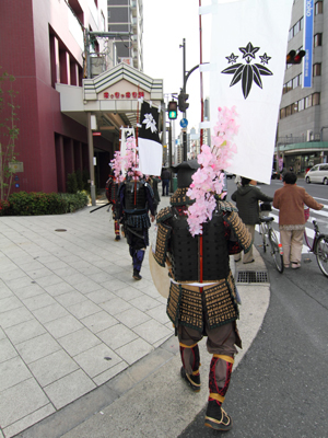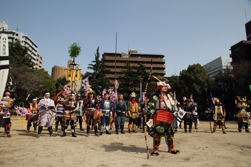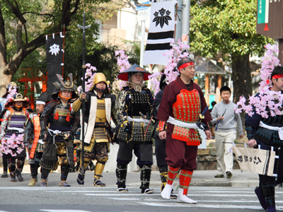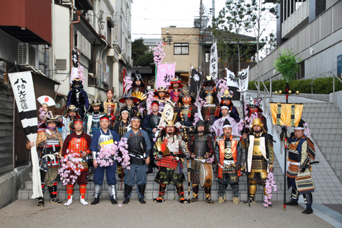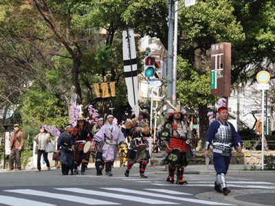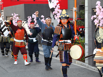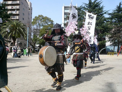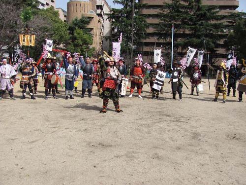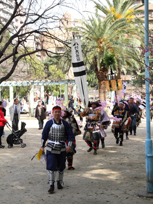 | 武者の総勢は25名。春の陣ののぼり旗の中を行軍します。また公園では知盛殿の剣舞を取り入れた出陣式を執り行いました。 | |||||||||