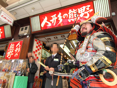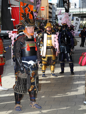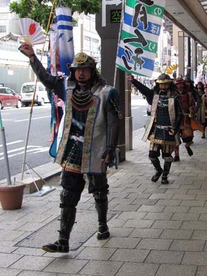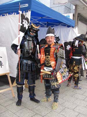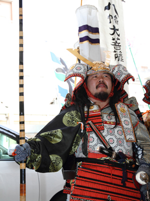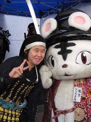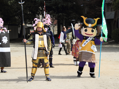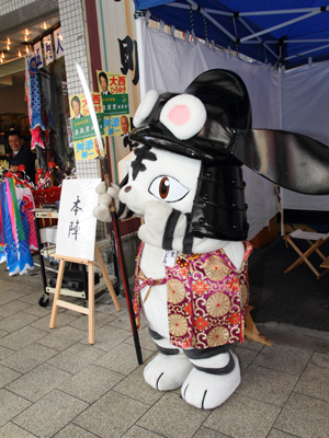 | 今回援軍として和歌山より雑賀衆甲冑隊さん、三重より津教室の皆さん、そして東警察よりかぶ丸君が参りました。出陣式開始前の30分前にはかぶ丸君たちに出陣していただき、客寄せをお願いしました。 | |||||||||