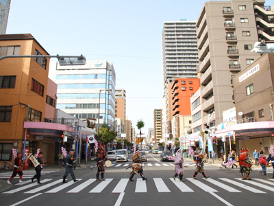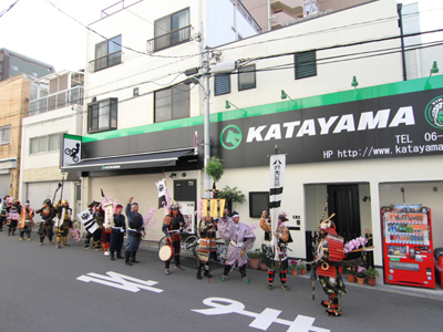| 今年も協賛金をお願いしているお店で勝鬨をし、また前会長、現会長に恒例の短歌献上の儀を執り行いました。 快晴の中の行軍はやっぱり最高ですね^^ 最後はとら丸君たちの待つ本陣に凱旋し、勝鬨を行いました。 |