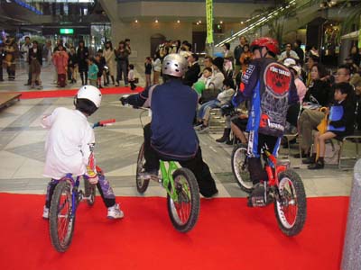 | さてこの日はカタヤマサイクルの誇るチームKATAYAMAの一人音野翔君たちもショーを催していました。そこで嫌々ながらも(大嘘^^;)人間まな板として武者の上を思う存分飛んでもらいました^^ |