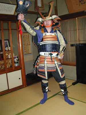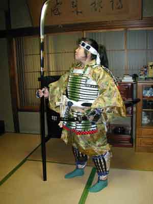 | 次に鎧直垂の上の方を省いた方法です。白小袖の上から直接篭手を着けるバージョンです。このバージョンでは陣羽織を纏ってみました。さあ、あなたの好みの意匠はどっち?? | |||||||