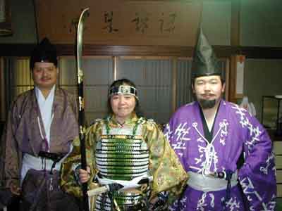 | 佐助殿【関口○厨房】 采女佑殿【三宅●司厨房】 2対1で○口厨房の勝ち・・・陣羽織バージョン、撤収・・・なわけありません^^;どちらも好評で、石和ではどちらで出陣されるのか楽しみです^^ちなみにこの日采女佑殿は初の鎧直垂を着用されました。直垂同好会に入会する日も近いです^^ |