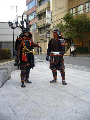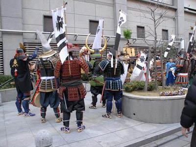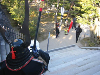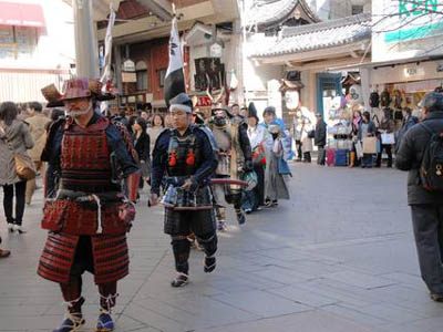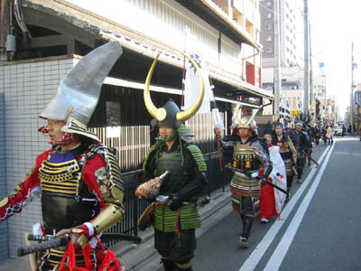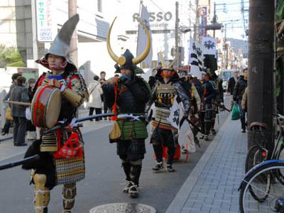| 異形の格好をし、鬼を追い払う京都節分。異形の格好をし、鬼を追い払う京都節分・お化け行列も今年で三度目の参加です。今回、人数集めに苦慮しましたが、今までで最高の17名もの武者が集まりました。また新撰組の方など他隊の方を含めますと30名近くの大行列となりました。 今年は大河『風林火山』に因み、武田信玄仕様での出陣です。 出陣式では旗揚げをし、そして鬨の声を挙げて意気揚々と出発いたしました。 |
