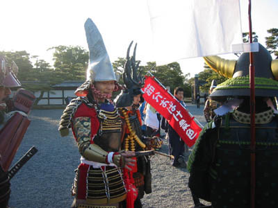 | まず三条通を通り、京都の繁華街・新京極へ。そして掛け声はいつものように「鬼は外、福は内、ごもっとも、ごもっとも」という独特の掛け声をし、練り歩きます。 武者隊で一番目立ったのは信玄の私ではなく、弁慶副長でした^^;すれ違う人に「あ、弁慶や」という言葉を何度もかけられました^^ さて新京極から一旦、ウエブマックスさん前に戻り、次は二条城に出発です。ここでは御旗先陣・富楠殿から後詰の木下殿へ、御馬標先陣山城殿から後詰玄蕃頭殿にバトンタッチいたしました。 |