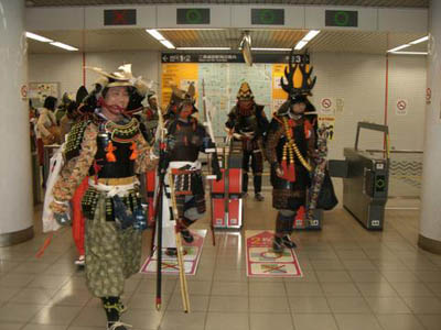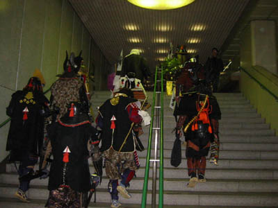| 帰りは地下鉄に乗って移動です。しかし幾度もこうした格好で乗車していますと平気になってしまいます^^;;うーん、普通に乗車している自分って、やっぱおかしいですね^^; とにもかくにも事故もトラブルもなく、無事に終了いたしました。 二次会は武尊殿のご好意で公家芋本舗さんにてご馳走になりました。また投扇興大会を催していただき、何と私が優勝してしまいました^^ いつもながら当方の無理を聞いていただきました武尊殿はじめ祭援隊の皆様、美味しい料理を振舞っていただきました公家芋本舗の皆様、そして多忙の時期に快く参加していただきました甲援隊・客将の皆様には篤く御礼申し上げますm_mまた来年も京より鬼を追い払いましょうぞ!! |