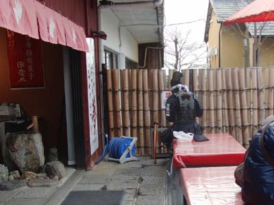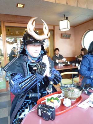 | 高台寺を出ると先発組はカフェで昼食を取っていました。 この日は甲援隊以外に芭雨さんを初め『銀魂』のコスプレの皆さんがご一緒でした。『銀魂』ファンの私は銀さんに「宇治金時丼食べないんですか?」と聞いてみたり、土方さんに「マヨはどうしましたマヨ?」などとすっかり銀魂モードに^^;でも甲援隊士のほとんどはガンダムはわかっても銀魂は知らない、という方が多いですので、全快モードは出しませんでした^^ |