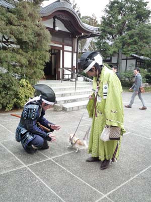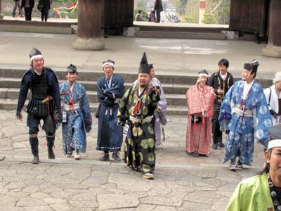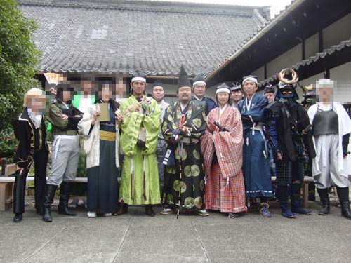 | その後円山公園を抜け、知恩院へ。 いつもながら知恩院は巨大で圧倒されます^^階段を登り、全員休憩とのんびりを談話しました。 知恩院を出て次に向かったのは青連院です。 こちらではまた銀さんたちと楽しく遊ばせていただきました^^またメガネをかけられた女性の方に「新八役お願いします」ともうちょっと止まらない状態に^^; 来年はサングラス持参して「マるで ダめな オち武者 略してマダオ」をやってみようかな、と企んでます。その時は同じ銀魂ファンの南雲さんたちにも来ていただきたいです^^ それから駐車している高台寺へと戻り、車を待っている間は中国観光客の方と楽しく記念撮影をしたり、片言中国語で交流出来とても楽しかったです。 こうして七回目の京都節分も終了いたしました。来年は清盛に因んで六波羅蜜寺へ行きたいですね^^ 最後に今年も色々とお世話いただきました武尊さん、芭雨さん、ウェブマックスさんには篤く御礼申し上げますm_m |