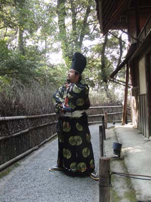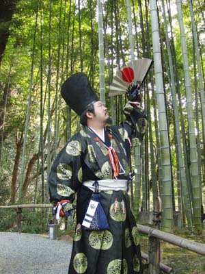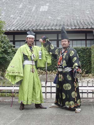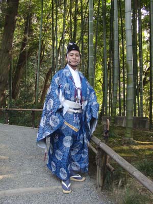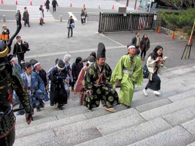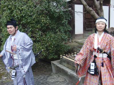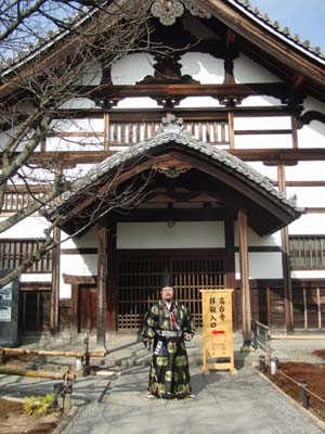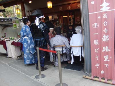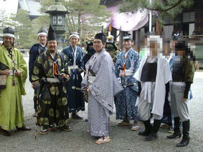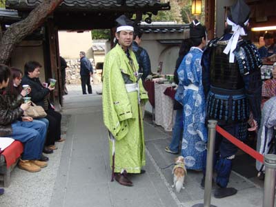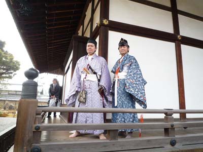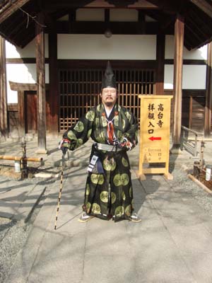 | 最近の京都節分は時期的に人数が少なく、昨年より散策会に切り替えております。昨年は『龍馬伝』に因んで坂本龍馬墓を中心に散策でしたが、今年は『江』に登場する北政所や秀吉に因んで高台寺が中心です。 甲援隊の大半は直垂で揃い、中々壮観でした^^ 私は黒の鎧直垂に立烏帽子、黒小袖をチョイスしました^^ 鎧直垂には通常白小袖なのですが、少し気分を変えて試してみました^^ さて予想以上の参加人数でしたので移動は三班に別れての移動です。私と山村さんは最後の便で移動。 高台寺へは待っていてくれました矢舞さんと合流して三人で参詣しました。 高台寺へは何度も参詣していますが、装束では初めてでした。この日は暖かく良いお天気で何もなければこのままずっと庭を鑑賞したかったです^^ それにしましてももう装束でお寺にいることに何の抵抗を感じないどころか、心休まる一海でした^^ |