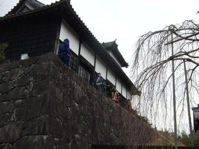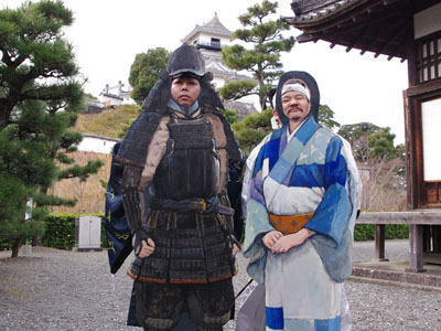 昨年もそうでしたが、掛川城のスタッフの皆さんが暖かく、迎えていただきました。また気温も温かく、風邪の心配をしなくて済みました。 しばらく天守下で観光客の方と記念撮影をした後、直垂に着替えた玄蕃さんと例のパネルを確かめるために登城することに。 二人ともええオッサンのため息を切らせながら登ったのですが、パネルがどこにもない^^; 最下層に写真があったのですが、どうやらパネルは撤去されていたようです^^;;うーん、ついに本人は見ず仕舞^^; 取りあえず天守を降りて本丸御殿へと向かったのですが、エラい角度で懸命に撮影するカメラマンの顔を見てビックリ。 何故か正勝さんがそこにいたのです^^ 「何でおんの??」 と思わず聞いてしまったほどです^^どうやらガンダムを見たついでに掛川へ寄られたとのことで、その後は正勝さんに撮影を一任いたしました^^ 本丸御殿では昨年のように遊びまくりました。やっぱり直垂に御殿はよく似合います^^ 御殿を出た後はのんびりと過ごしました。 途中非公開の櫓を見せていただいてのですが、階段のない坂を上らないと行けませんでしたので、断念しまいsた。白の直垂でしたので術ってしまえば泣くに泣けないからです^^; で、やっぱり直垂姿の玄蕃さんが転んだようでs、この決断は大正解でした^^ 閉館までいるつもりだったのですが、じっとしていると体が固まってきましたので、撤収することになりました。 |