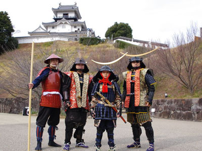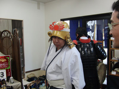 | 昨年に続き二回目の掛川城での装束新年会です。 本来なら13時ごろになる予定でしたが、11時半に到着。 早速鎧屋さんに向かい、着替えをさせていただきました^^鎧屋さんは初めてだったのですが、玄関に鎧が看板として出ていたり、お城の一角と思わせるような建物でしたので驚きました^^ |