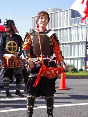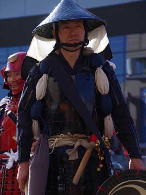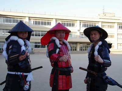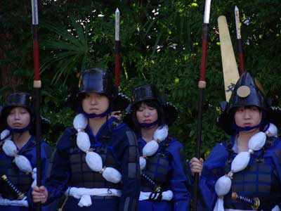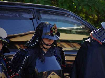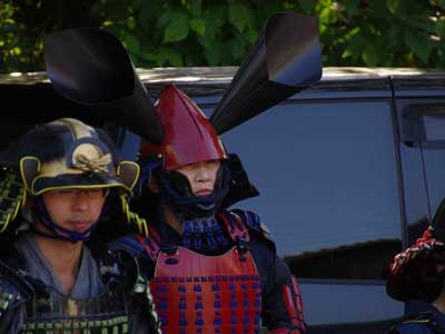 | 甲援隊の皆さん共々参加させていただきました。 今年も高虎公の御下知により凱旋式を担当させていただきました。 さて朝。 もうホントに津の方の日頃の行いが良いのだと思うのですが、これが最高のお天気。一週間前でしたら強烈な暑さでしたし、二日遅ければこれまた強烈な台風がやって来ていたところでした。 若干暑かったのですが、風が涼しかったですので、表に出ると爽快でした。 今回、甲援隊は正規の隊士と陣借の客将混合軍。 ですが違和感なく御一緒出来ました^^ 今年の集合時間が9時ということもあり、難なく集合時間までに現地入りが出来ました。矢舞さんの車で小学校まで送っていただき、準備開始。 凱旋式の台詞を忘れないよう少し緊張しながら着替えです。 全体練習と説明会の後は凱旋式の説明・練習です。 こばっちさんや夕凪さん、Sさんたちスタッフのご協力のもと、しっかりと説明が出来ました。 合間には皆さんとの挨拶もいたしました。景虎さんのフライング土下座に対し、フライング土下寝をしたりなど交流を深めつつ(どんな深め方やねん^^;)、本番を待ちます。 練習会のあとは昼食。 ここで一つだけ残念なことが… …ない! …津餃子がない…ぐはっ!! ですが全てが終了後に幽霊雑兵さんの手作りジャムをいただきましたので、我が心の隙間は無事埋められたのでありました。…来年は手作りマーマレードが食べてみたいと密かに(?)パンを食べながら念じる今日この頃です^^ 今回の甲冑はようやく完成しました黒糸縅。 三回目の大袖は何とか上手く耐久しておりました^^ ただここ二ヵ月ほどで少しリバウンドしていたため、その点が不満足でした。…現在は少しリバウンド状態が止まりかけておりますので、来年の津では70を切った状態で参加したいです^^ と、個人的でどうでも良い一海の心理状況はさておき、いよいよ本番です。 |