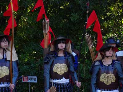 思わぬ太鼓演奏がありましたが、そこは夕凪さんやSさんのサポートと津の方たちのご協力で無事乗り切ることが出来ました。 太鼓演奏終了直後に高虎公御本陣が到着。 静寂の中、凱旋式が執り行われます。 まず武者が勢ぞろいする中を高虎公御夫妻が御参拝。 そして武者たちがそれぞれ参拝し、会場へ。 会場では法螺貝の吹き合わせ、三献の儀が行われ、いよいよ演武です。 演武は太鼓、槍、そして矢舞さんの琵琶演奏。 新たなスキルが生まれた演武となりました。 演武終了後はご夫妻からお言葉を賜り、 勝鬨です。 勝鬨後は更に気を引き締めるべく軍律を読みあげます。 実は軍律読みあげをしたくて、このシナリオを書いてみました^^(うーん私心たっぷり♪) 軍律を読み終えた後、全員に見せて頭を下げていただいたのですが、これが見事にウェーブをしまして、ドキドキしてしまいました^^ 来年も機会を与えていただきましたら、図に乗ってまた読みあげをさせていただきたいと思います^^ 神社から小学校まで戻るのですが、最後の気合を入れ、元気よく行軍です。 |